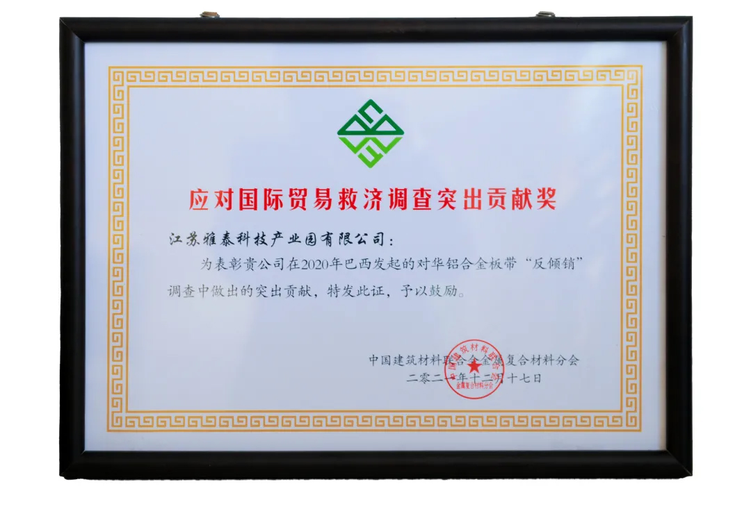 2021年,受各種不可抗力因素影響,國(guó)際市場(chǎng)貿(mào)易摩擦不斷,雅泰外貿(mào)形勢(shì)略為嚴(yán)峻,但雅泰通過(guò)強(qiáng)大的國(guó)家背書(shū),尋求各方支持幫助、積極應(yīng)對(duì),成功打贏反傾銷一案,大會(huì)特別頒發(fā) “應(yīng)對(duì)國(guó)際貿(mào)易救濟(jì)調(diào)查突出貢獻(xiàn)獎(jiǎng)” 。